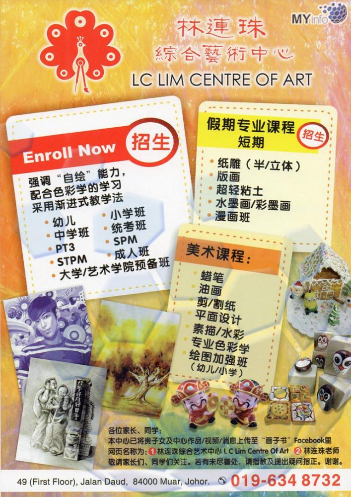 林连珠综合艺术中心 No 49, First Floor, Jalan Daud, 84000 Muar Johor Malaysia Tel: 019-634 8732 Facebook Page (Click Here) M150318 美术班 Art Courses |